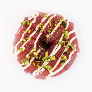 Filetti di tonno, salsa mayo e granella di pistacchio di Bronte DOP.