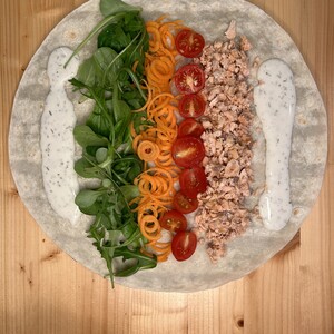 Salmone sbriciolato cotto alla piastra, insalata verde, pomodori, carote, cipolla fritta croccante e deliziosa salsa alle erbette